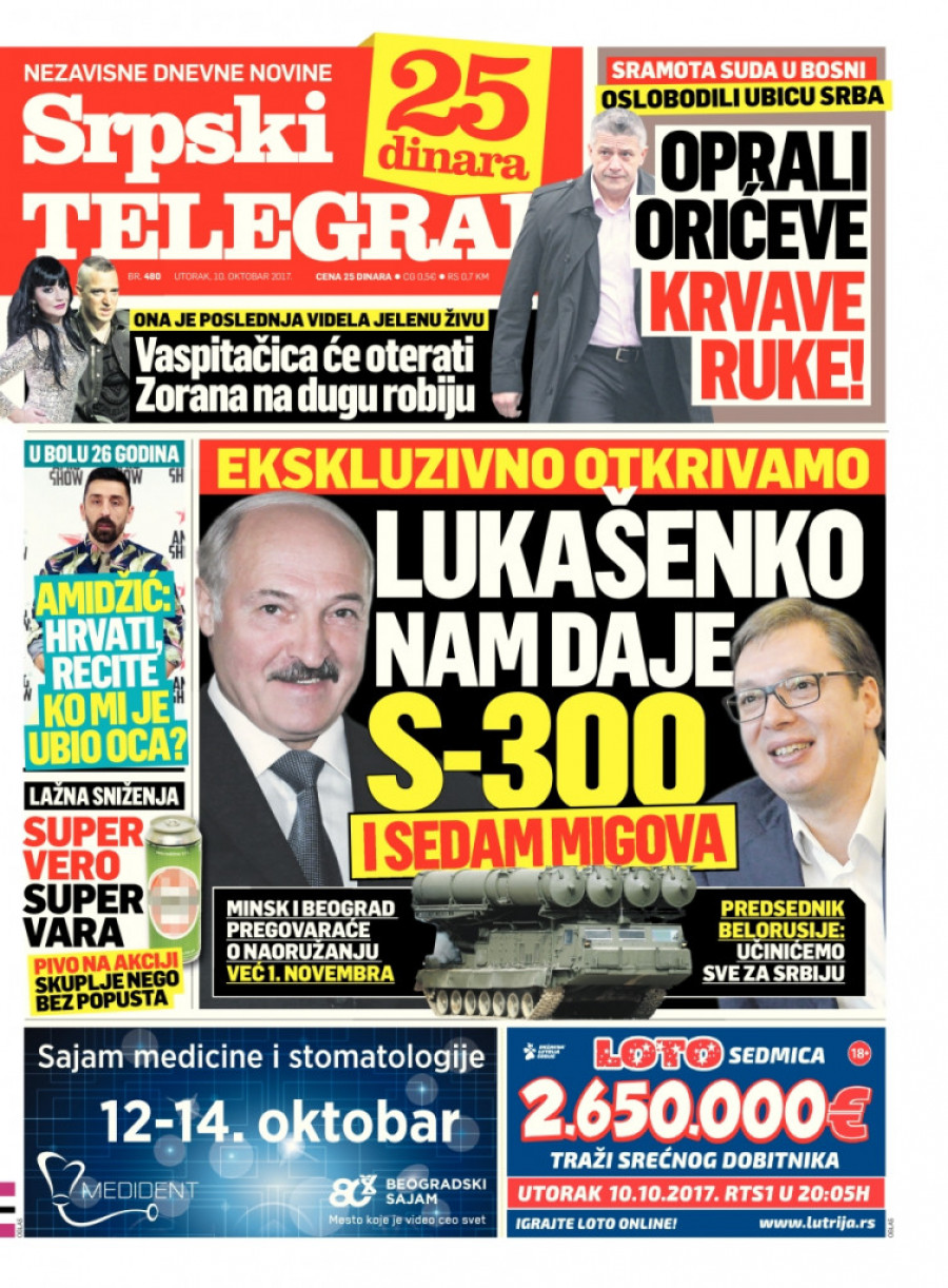- Predsednik države će se 1. novembra sresti sa beloruskim predsednikom Aleksandrom Lukašenkom. Glavna tema biće nabavka sistema S-300. Pore toga, Srbija će od Belorusije kupiti još sedam migova 29 - navodi odlično obavešten izvor Srpskog telegrafa.