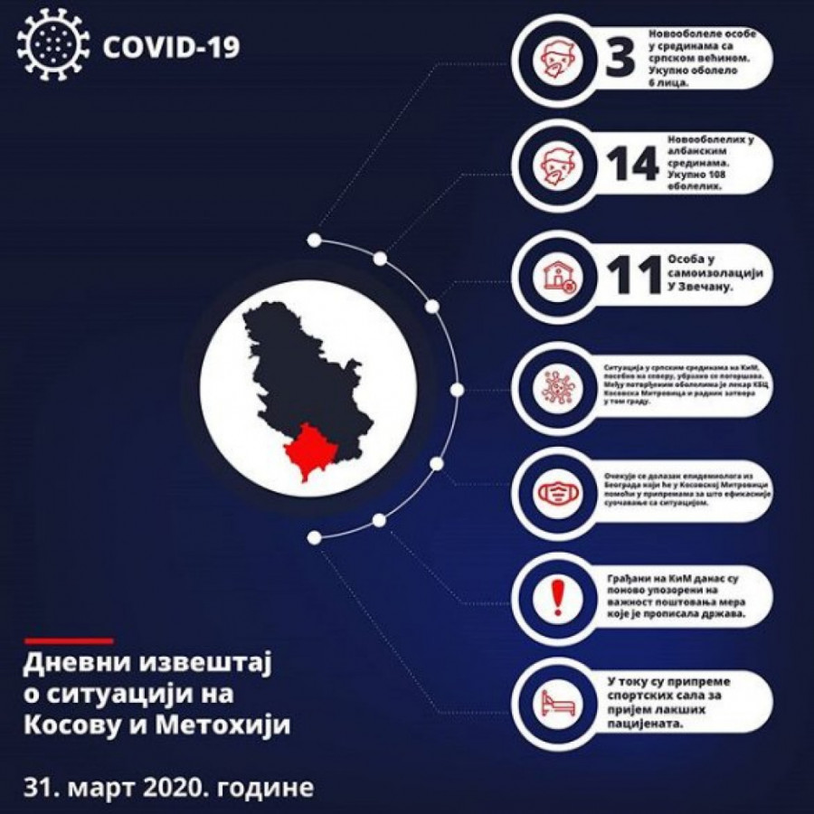 "Na Kosovu i Metohiji u srpskim sredinama broj novoobolelih povećao se danas sa tri na šest, a u Zvečanu je 11 osoba u samoizolaciji", napisao je na instagramu direktor Kancelarije za KiM Marko Ðurić i upozorio da se situacija ubrzano pogoršava.