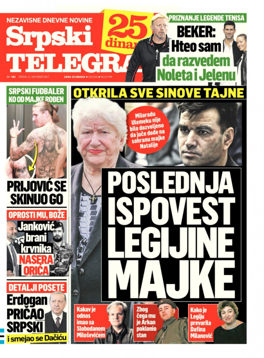 U svom poslednjem intervjuu Natalija Ulemek (82), majka nekadašnjeg komandanta JSO i najčuvanijeg srpskog zatvorenika Milorada Ulemeka Legije, optuženog za najteže zločine, među kojima i za ubistvo premijera Zorana Đinđića, opisala je put svog sina od slabašnog dečkića, koji je volelo da svira klavir, pa sve do jednog od najizdržljivijih legionara, a potom i najvećeg državnog neprijatelja. Do kraja života ona nije želela da poveruje da je njen sin učestvovao u najtežim zločinima, među kojima i u ubistvu premijera Zorana Đinđića.