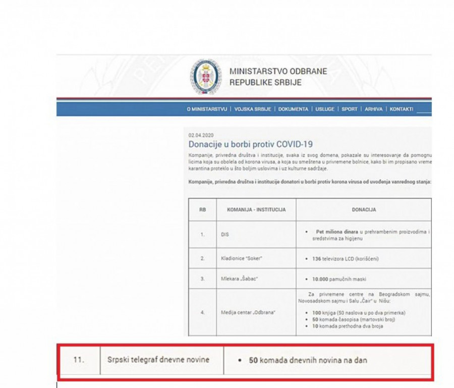 Da je Ćulibrk slagao, potvrđuje i dokument objavljen na sajtu Ministarstva odbrane, gde je objavljen spisak svih donatora u borbi protiv KOVID-19.