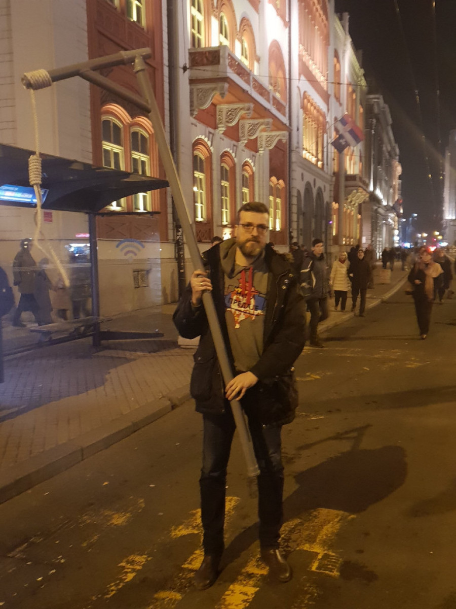 Foto: Tanjug/APPodsećamo, Nogo je zbog incidenta sa vešalima koje je nosio na protestima opozicije izbačen iz stranke Dveri pod pritiskom šefa opozicije Dragana Đilasa, kako bi se se ovaj u narodu pokazao kao miroljubiv i veliki protivnik nasilja. Lider Dveri Boško Obradović je ovu odluku tada progurao kako bi se dodvorio svom novom šefu.