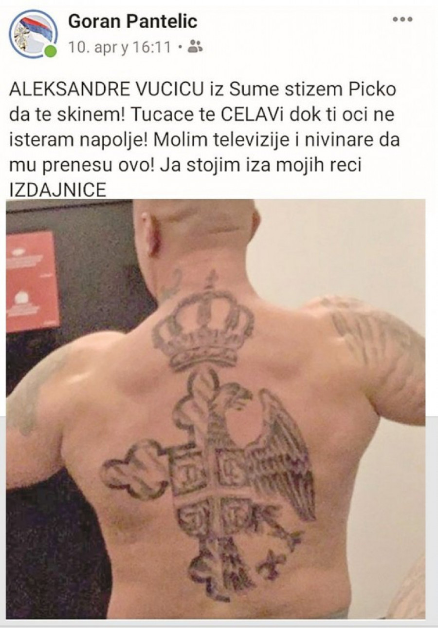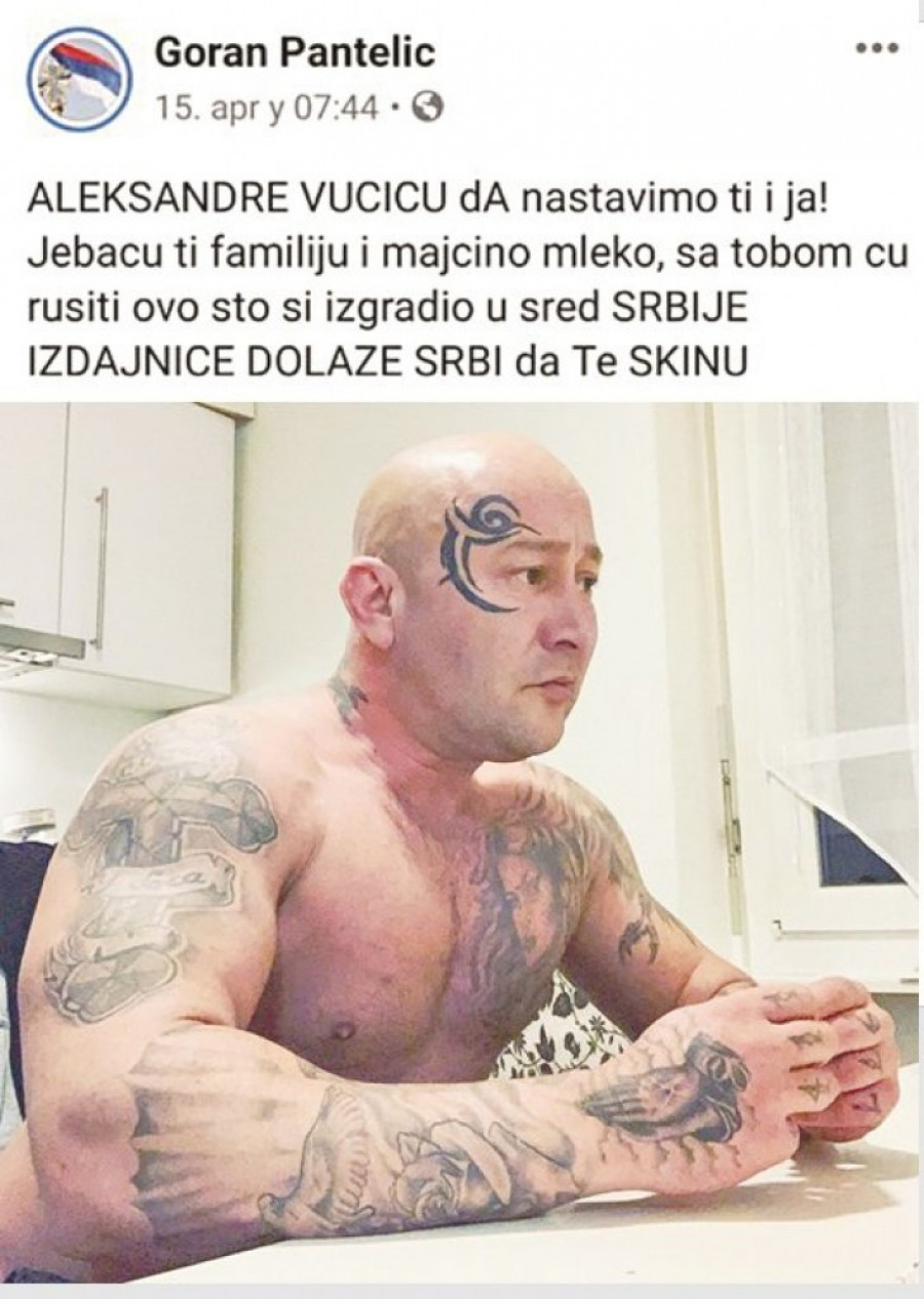 - Aleksandre Vučiću, iz šume stižem, pi*ko, da te skinem! Tu*aću te, ćelavi, dok ti oči ne isteram napolje! Molim televizije i novinare da mu prenesu ovo! Ja stojim iza mojih reči, izdajice - samo je jedna od niza teških i vulgarnih pretnji koje je uputio Pantelić.