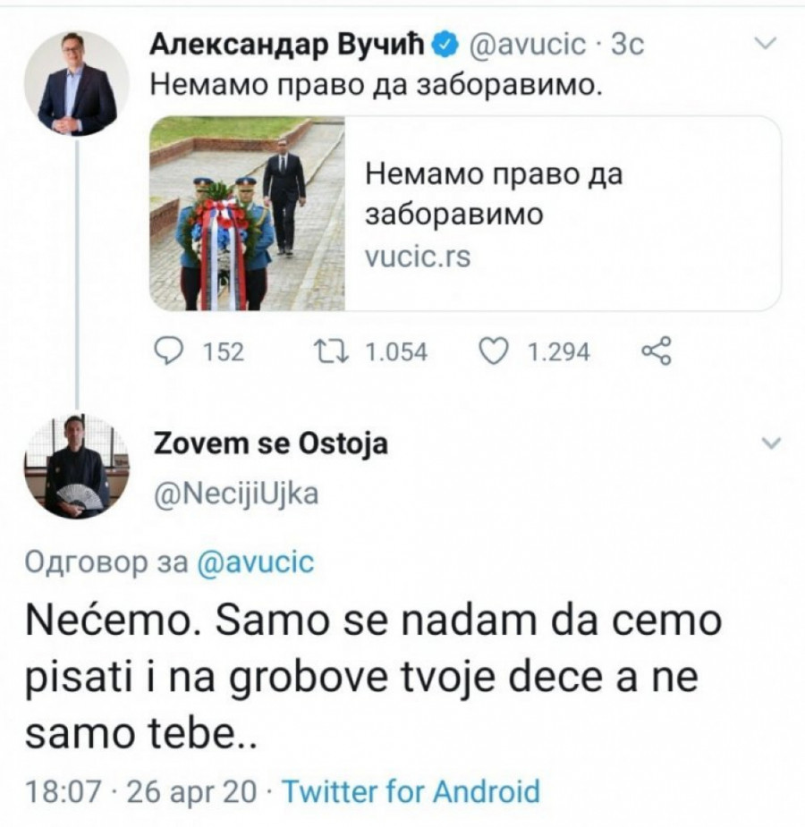 Foto: Tanjug/R. PRELIĆNa objavu predsednika Vučića na Tviteru u kojoj piše: "Nemamo pravo da zaboravimo", sa današnjeg polaganja venaca za Dan sećanja na žrtve ustaškog koncentracionog logora Jasenovac u Drugom svetskom ratu, ovaj Đilasov simpatizer odgovorio je pretnjom.