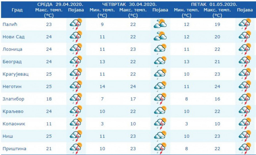 Foto: RHMZ/printscreenJutarnja temperatura od 8 do 14 stepeni, najviša dnevna od 20 do 24 stepena. Vetar će biti slab i umeren zapadni i severozapadni.