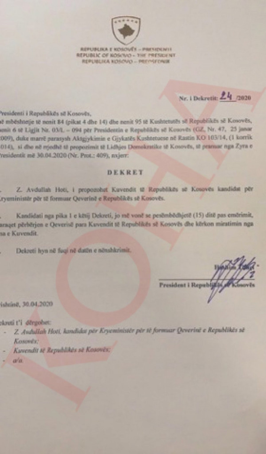Prema tom dokumentu, koji je potpisao Tači, Hoti je predložen Skupštini Kosova kao kandidat za premijera za formiranje Vlade Kosova.