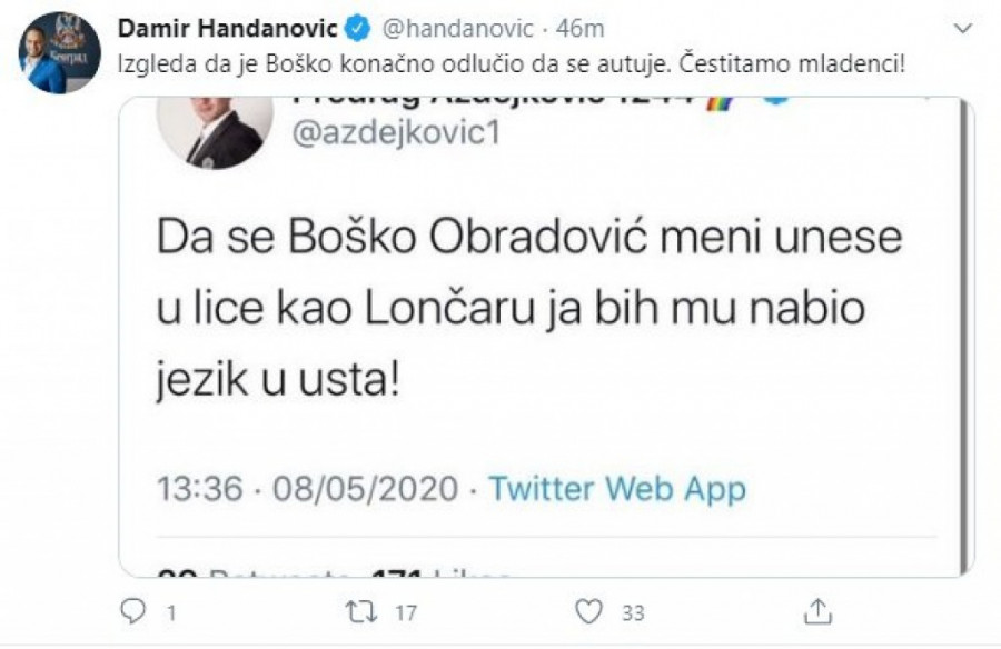 Gej aktivista Predrag Azdejković oglasio se na Tviteru povodom divljačkog ponašanja lidera Dveri Boška Obradovića ispred Skupštine i poslao mu vrlo otvorenu ponudu.