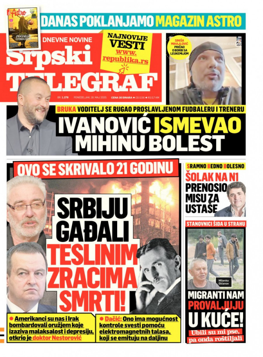 Naslovna strana Srpskog telegrafa za 18. maj 2020. godine