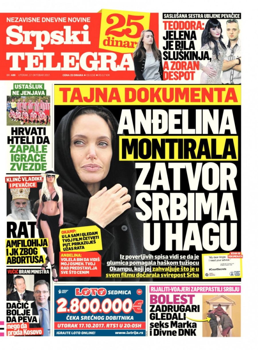 Mržnja holivudske glumice Anđeline Džoli prema Srbima nedvosmisleno je potvrđena nakon što su procurili tajni dokumenti koji pokazuju da je usko sarađivala sa Haškim tribunalom, gde su uglavnom osuđivani Srbi za zločine i protiv kojih je podnet najveći broj optužnica.