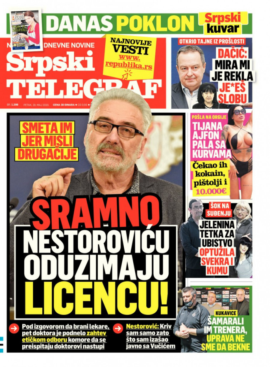 Doktoru Nestoroviću hoće da uzmu licencu samo zato što je stao na branik otadžbine u borbi protiv koronavirusa. Etički komitet Lekarske komore Srbije (LKS) sledeće sedmice raspravljaće o zahtevu grupe članova da se poznati profesor i pulmolog javno osudi zbog izjava koje je davao kao član kriznog štaba. A ta javna osuda, u krajnjem ishodu, značila bi da mu se oduzme pravo na rad.