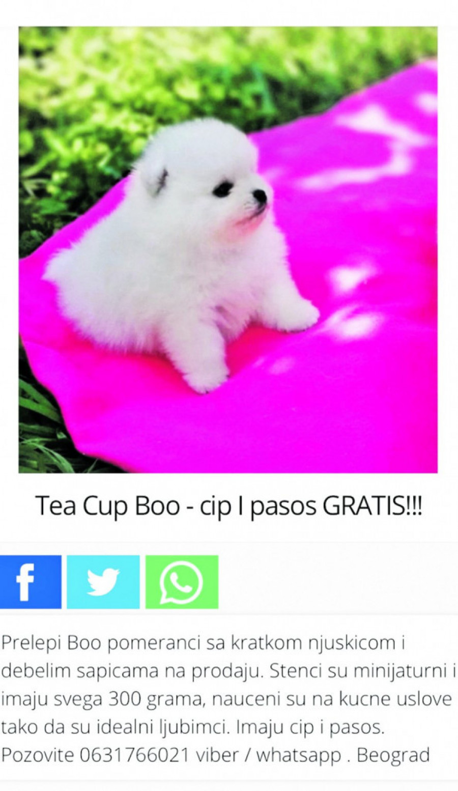 2. Oglašavaju prodaju pomeranskog špica, čija je cena od 1.000 do 3.000 evra i stavljaju fotografiju pravog pomeranca