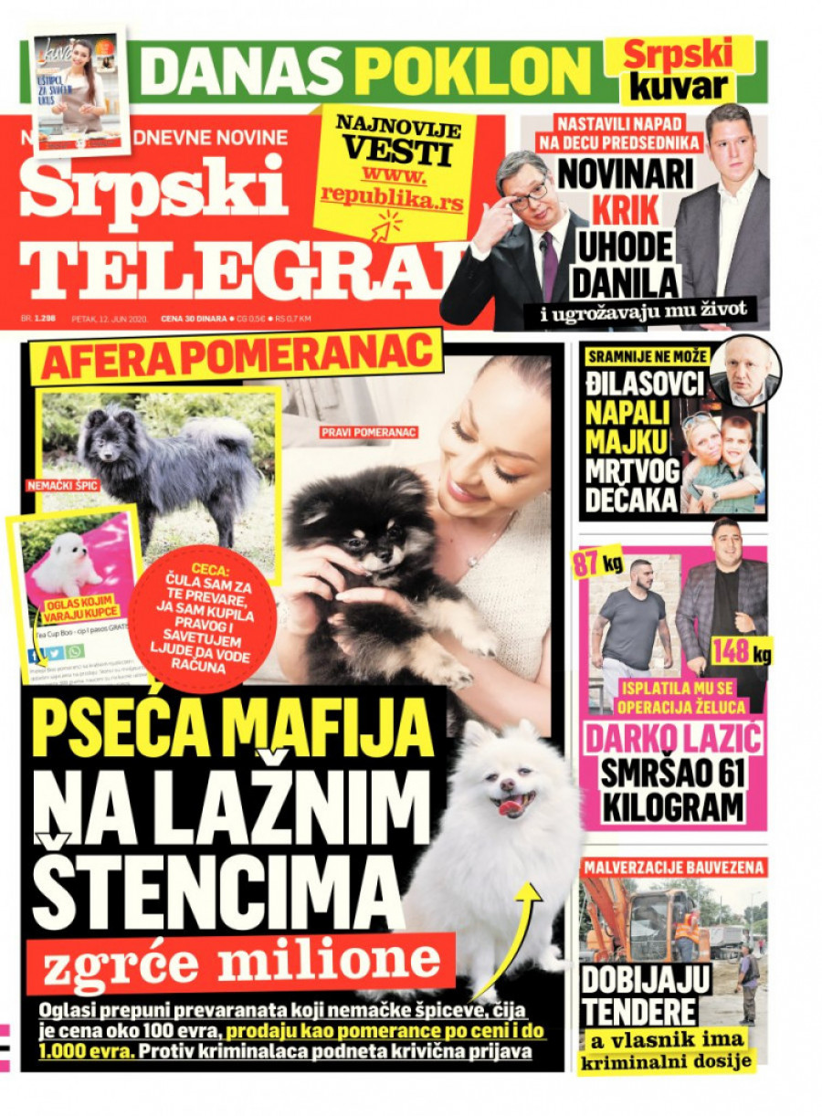 Naslovna strana Srpskog telegrafa za 12. jun 2020.