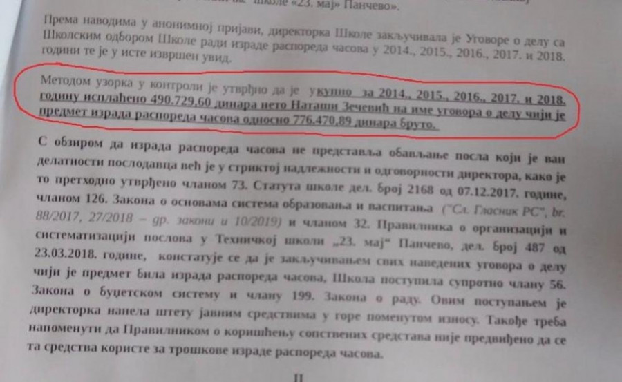 Foto: printscreen/facebookDirektorka Tehničke škole Nataša Zečević, kako je utvrdila Budžetska inspekcija Grada Pančeva, je protivzakonito, na osnovu Ugovora o delu koji je zaključivala sa Školskim odborom za izradu rasporeda časova, u periodu od 2014. do 2019. godine uzela neverovatnih 776.000 hiljada dinara. Dok su ostali profesori za ovu uslugu plaćani 20 hiljada dinara, i to za celu školsku godinu, direktorka je procenila da je njen rad mnogo vredniji.