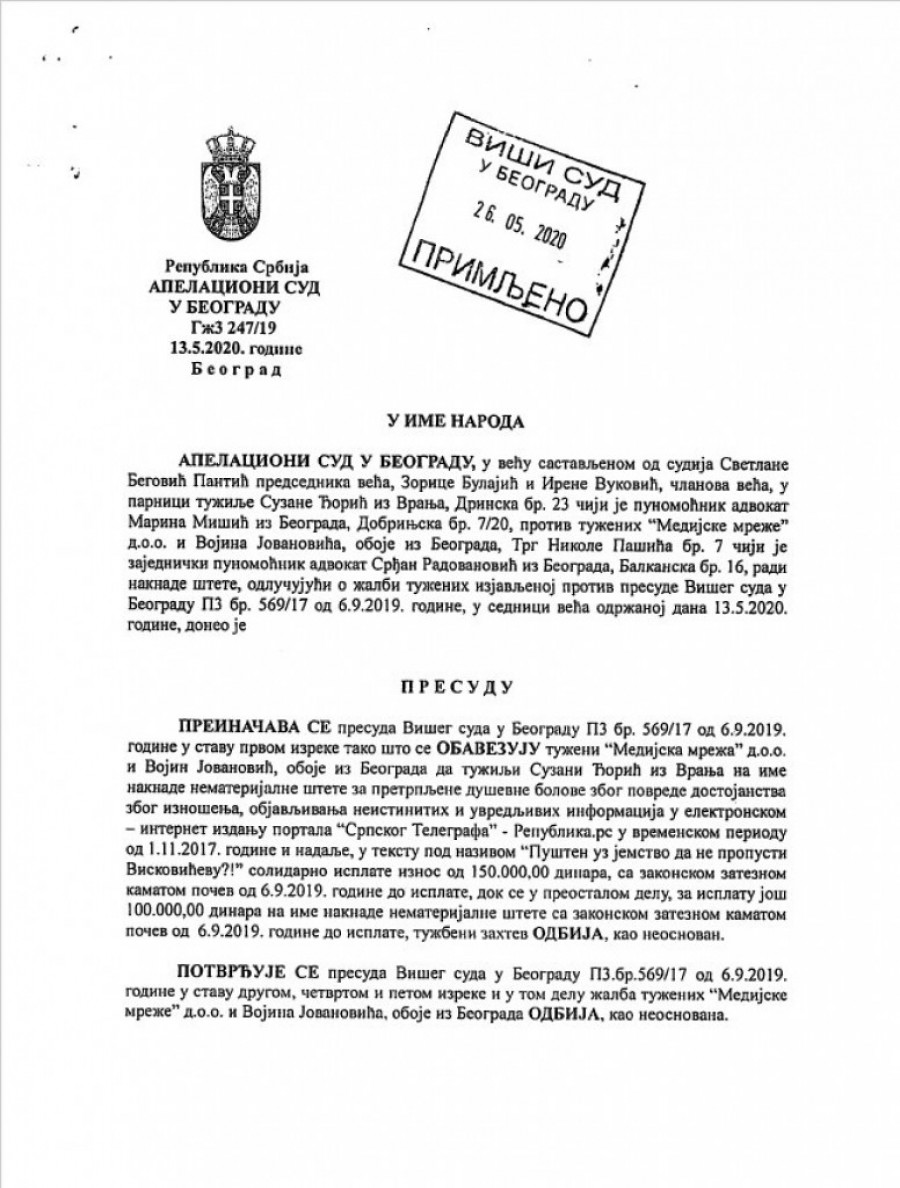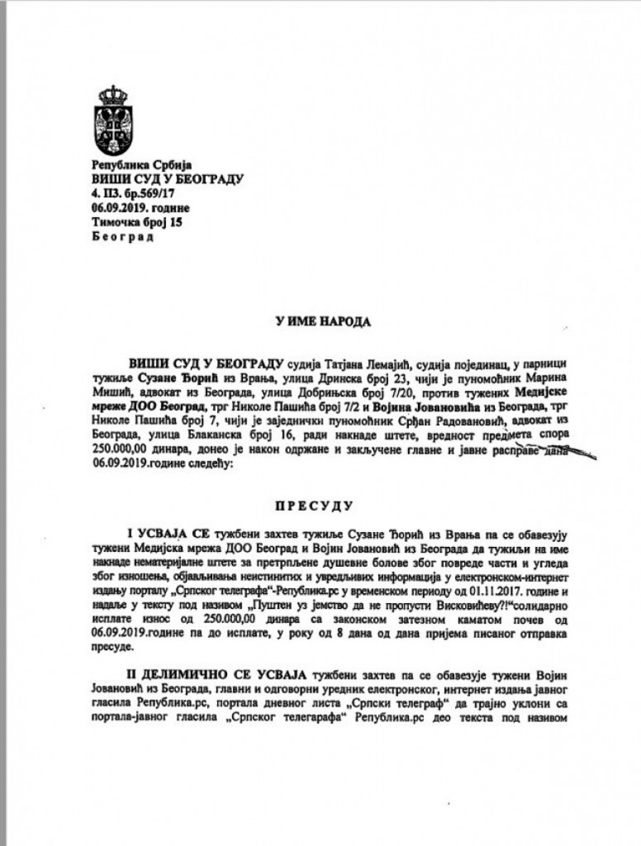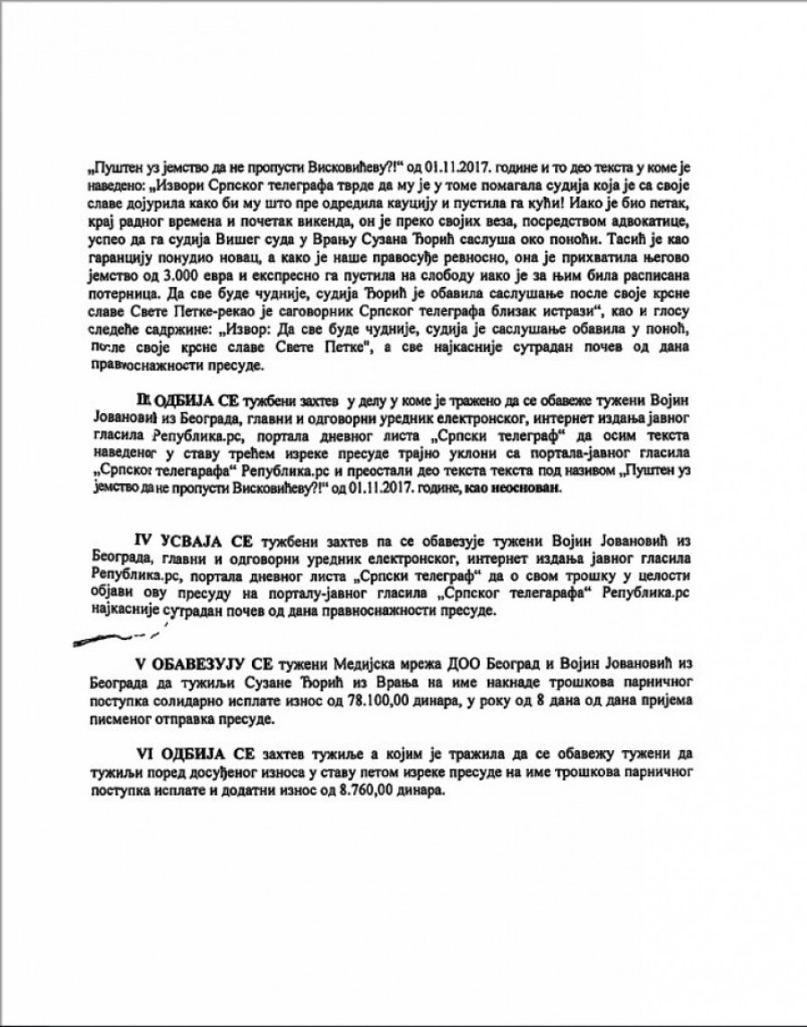Po nalogu Apelacionog suda u Beogradu redakcija portala Republika objavljuje presudu u vezi sa tekstom "Pušten uz jemstvo da ne propusti Viskovićevu?!" koji je objavljen 1. 11. 2017. godine