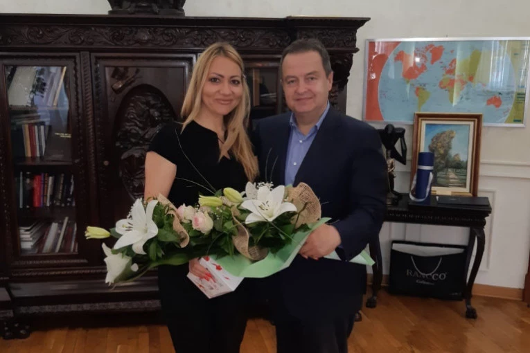 Kada je stigla, ministar Dačić je iznenadio sa velikim buketom cveća, jer se kao već poznati džentlmen setio da im je danas 27 godina braka.