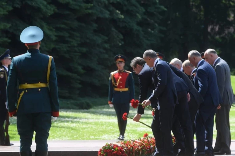 Predsednik Srbije Aleksandar Vučić položio je danas, po završetku defilea vojske na Crvenom trgu, cveće na spomenik Neznanom junaku, a nakon toga usledio je srdačan pozdrav sa ministrom odbrane Sergejom Šojguom.