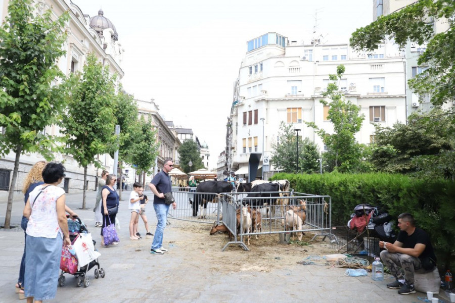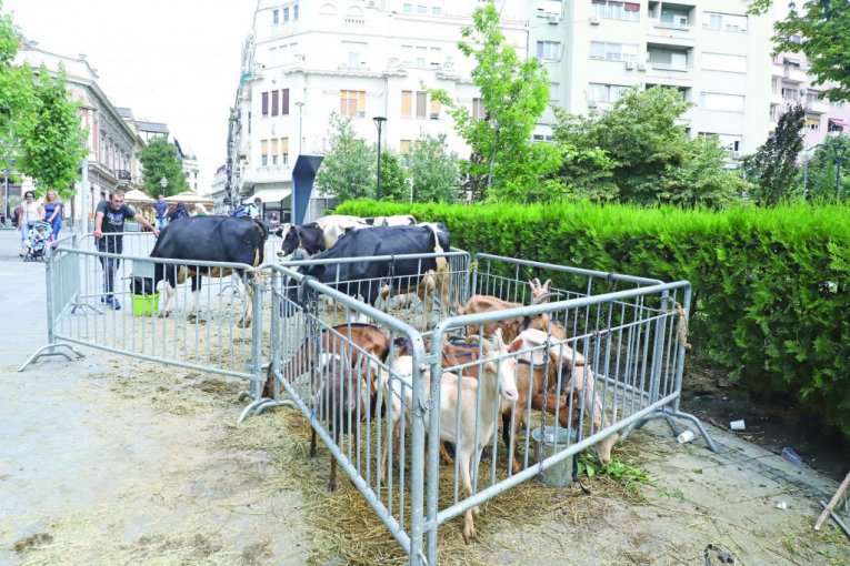 Foto: Tanjug/R. PRELIĆ- Stočna pijaca ispred Muzeja primenjene umetnosti, u pešačkoj zoni, u centru grada. Mi bukvalno živimo "Životinjsku farmu" - napisao je Balša Božović i podelio sliku krave i koza u ograđenom prostoru ispred muzeja.