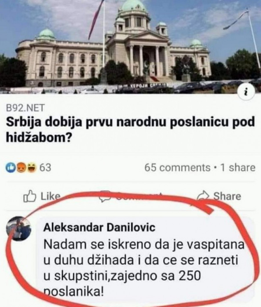Foto: N1/Sanapress/printskrinNa vest da će u sledećem sazivu Skupštine Srbije jedna poslanica nositi hidžab jedan tviteraš je napisao - nadam se iskreno da je vaspitana u duhu džihada i da će se razneti u skupštini, zajedno sa 250 poslanika.