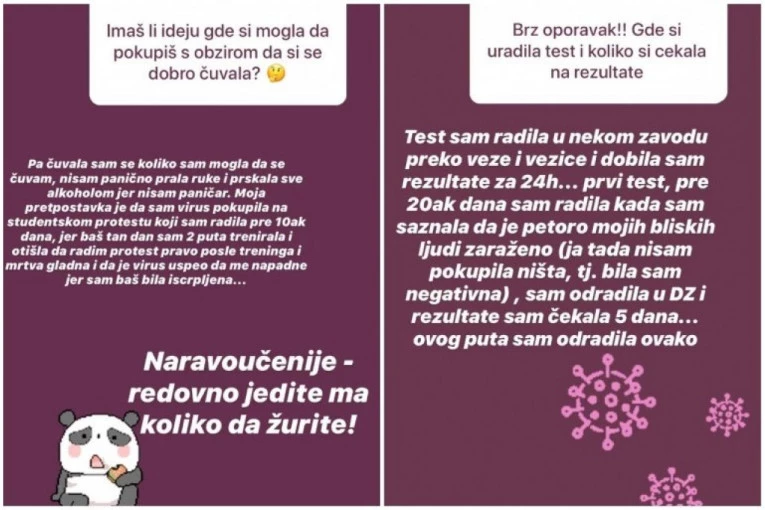 - Moja pretpostavka je da sam virus pokupila na studentskom protestu koji sam radila pred 10ak dana, jer baš taj dan sam 2 puta trenirala i otišla da radim protest posle treninga i mrtva gladna i da je virus uspeo da me napadne jer sam bila baš iscrpljena... - navela je ona.