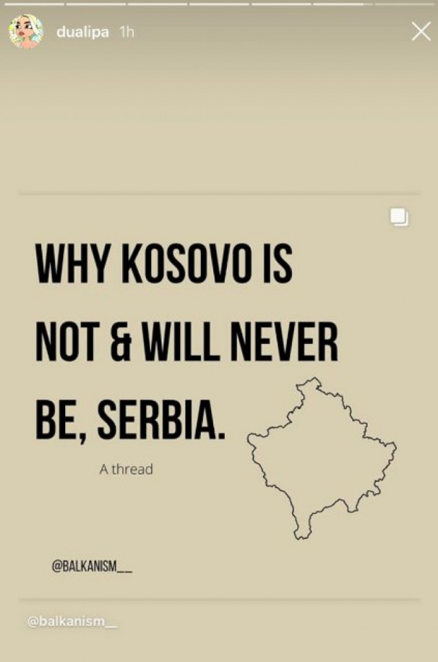 Engleska pevačica Dua Lipa čije je poreklo sa Kosova i Metohije objavila je na svom Instagram profilu nekoliko sramnih poruka u kojima promoviše Kosovo kao nezavisnu državu.