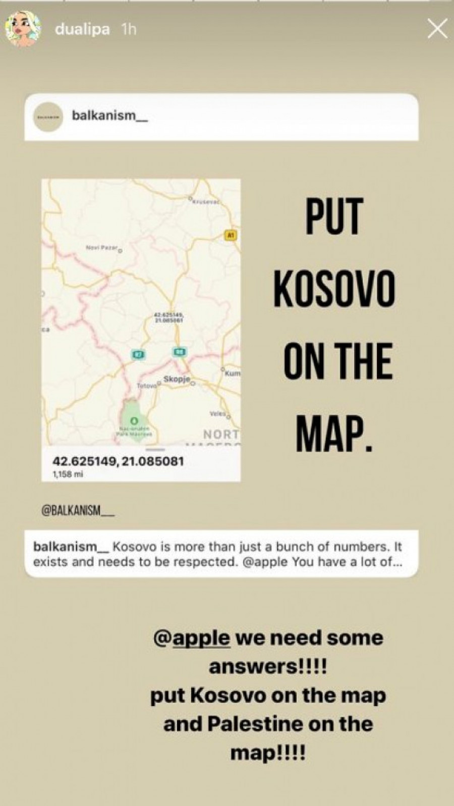 Foto: InstagramZatim je Dua Lipa napisala, "Stavite Kosovo na mapu. Kosovo je više od gomile ljudi. Ono postoji i treba ga poštovati. Stavite na mapu Kosovo i Palestinu".