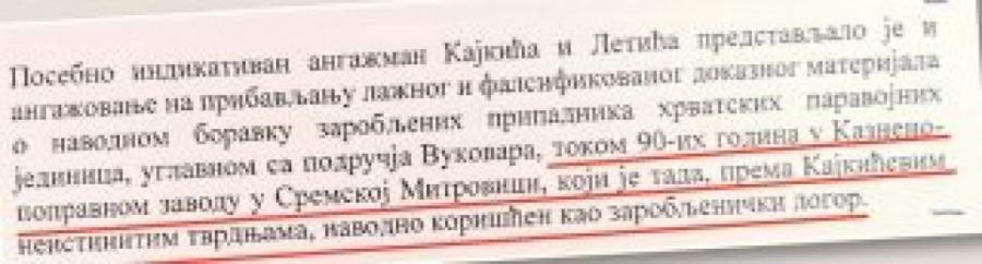 Posebno indikativan angažman Kajkića i Letića predstavljalo je i pribavljanje falsifikovanog dokaznog materijala o navodnom boravku zarobljenih pripadnika hrvatskih paravojnih formacija, uglavnom sa područja Vukovara, devedesetih godina u Kazneno-popravnom zavodu u Sremskoj Mitrovici. Prema tim lažnim navodima, taj zatvor je korišćen kao zarobljenički logor.