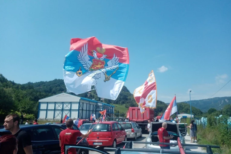 Foto: Tanjug/A. VUKELIĆKolona dugačka više od pet kilometara stigla je pred granicu sa Crnom Gorom dok se u vazduhu vijore zastave sa natpisom "NE DAMO SVETINJE".