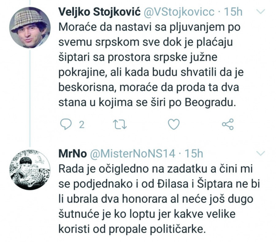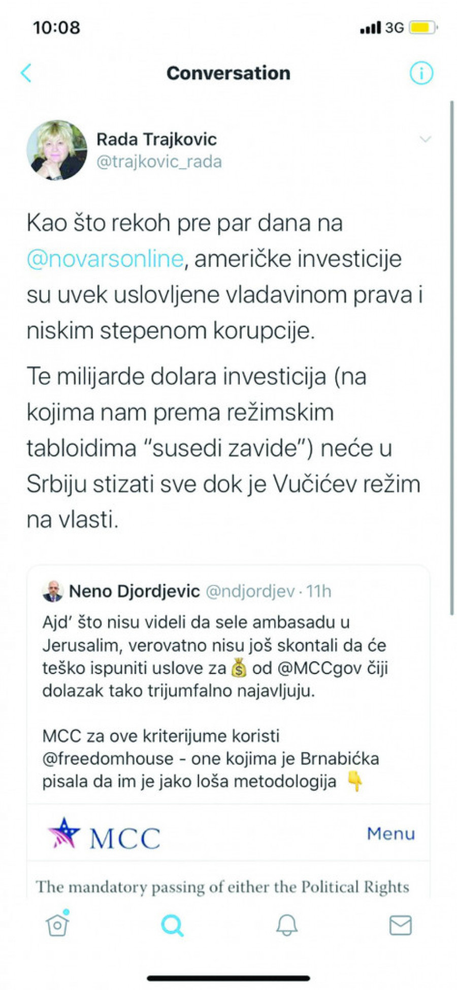 - Te milijarde dolara investicija (na kojima nam, prema režimskim tabloidima ,"susedi zavide") neće u Srbiju stizati sve dok je Vučićev režim na vlasti - piše na Tviteru Rada Trajković, na šta su reagovali pojedini Tviter korisnici, konstatujući da, pljujući po svemu srpskom, ubira honorar od Đilasa i od Šiptara.