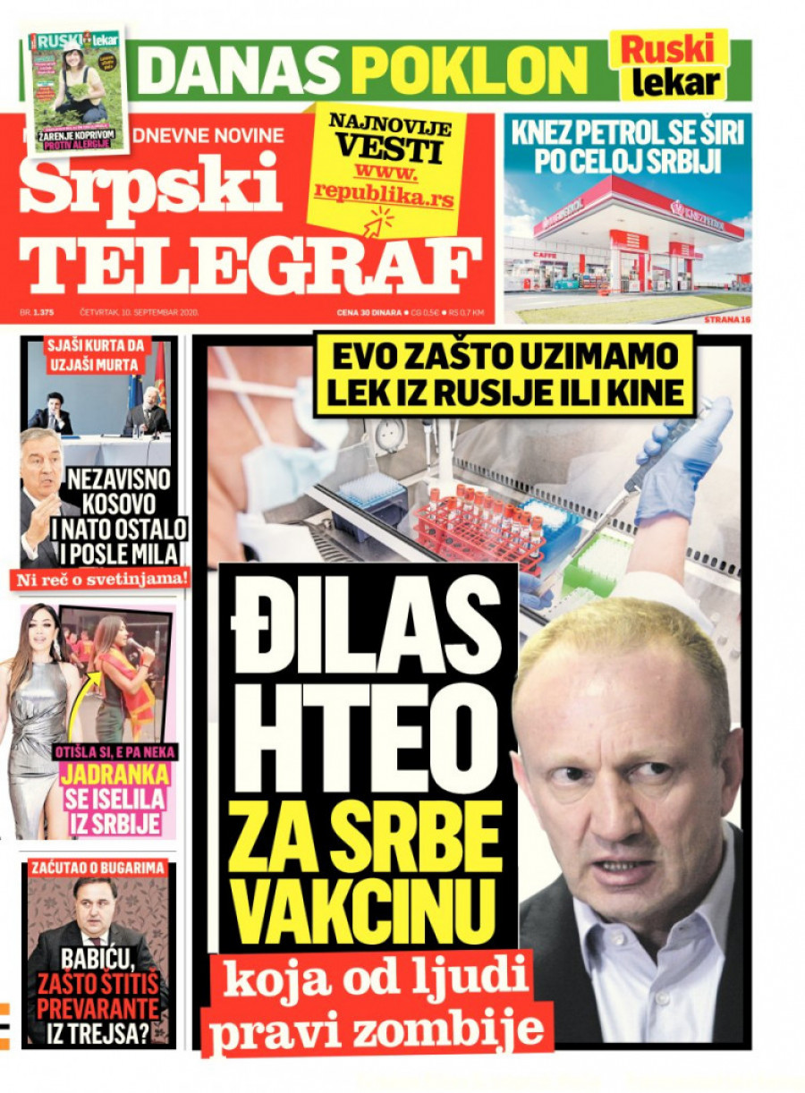 Osim toga, u sutrašnjem izdanju Srpskog telegrafa možete čitati i detalje užasne nesreće na Dobanovačkoj petlji u kojoj je život izgubila trudnica i još jedan muškarac, kao i detalje sa suđenja Milošu Srebriću Flekici optuženom za ubistvo Kristine Kapelan na benzinskoj pumpi. Takođe, možete čitati i koju je to vakcinu Dragan Đilas predlagao za građane Srbije i zašto je ona štetna i zašto direktor "Koridora Srbije" Zoran Babić štiti bugarsku putarsku firmu "Trejs" koja vršlja po Srbiji. O svemu ovome možete čitati i na portalu Republika.