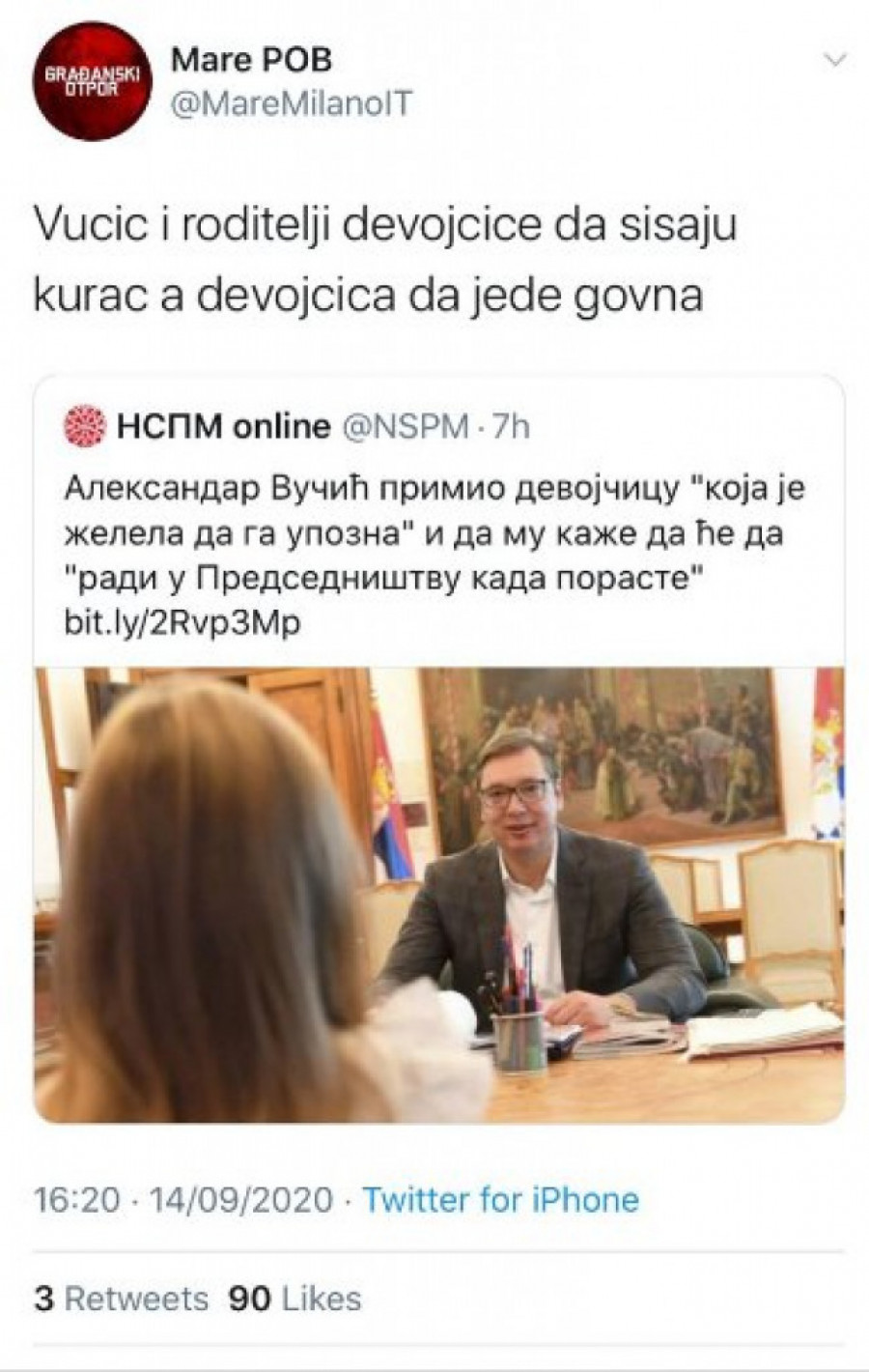 Istom uvredom se obratio i predsedniku Vučiću, a maloj devojčici je rekao da jede go*na!