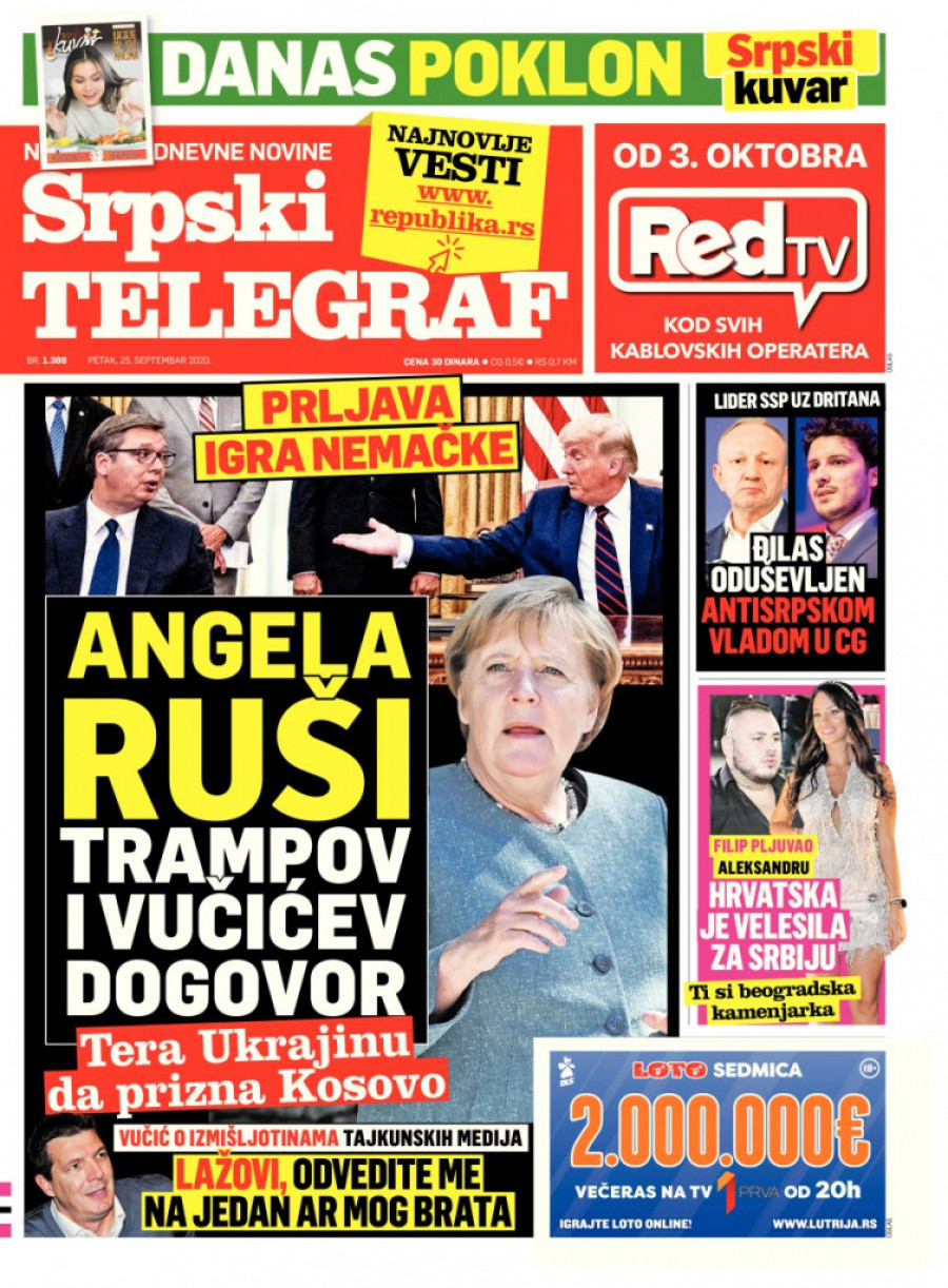 Nemačka, predvođena kancelarkom Angelom Merkel, zaoštrila je prljavu diplomatsku igru. Cilj je rušenje sporazuma koji su u prisustvu Donalda Trampa potpisali Beograd i Priština, koji, pored ekonomskih tema (pogledajte okvir), propisuje moratorijum ili zabranu u zahtevima za priznaje prištinske nezavisnosti.