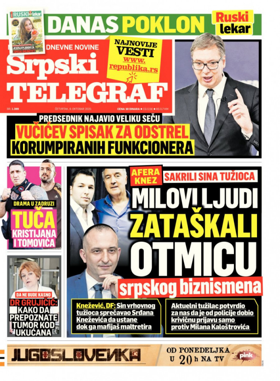 Naslovna strana Srpskog telegrafa za 08. oktobar 2020