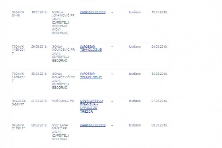 NJIMA NAJVIŠE DUGUJE IVANOVIĆFirma Broj naplata putem izvršitelja "Infostan" 7 "Parking servis" 11 Porez 12 Ostalih pet naplaćeno preko izvršitelja, imena poverilaca nisu navedena |