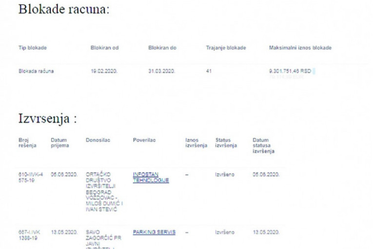 - Nema ko ga nije jurio za novac koji duguje gradskim službama i državi. Poslednji put, kako piše u dokumentima, na vratima su mu bili 5. juna 2020. i to zbog dugovanja koje je imao prema "Infostanu".