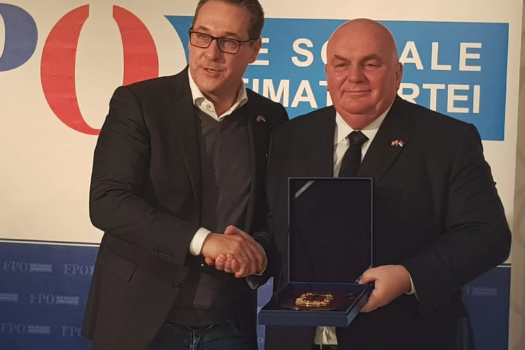 Dragan Markovic Palma je svom domaćinu poklonio značku sa srpskom i austrijskom zastavom, rekavši da Štrahe zaslužuje da nosi srpsku zastavu.