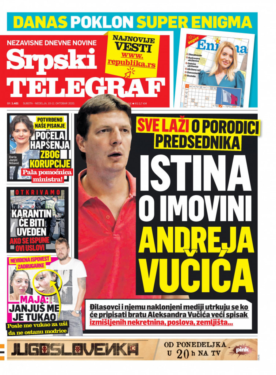Foto: Tanjug/J. PAPSrpski telegraf u štampanom izdanju od 10. oktobra donosi pregršt važnih i interesantnih priča.