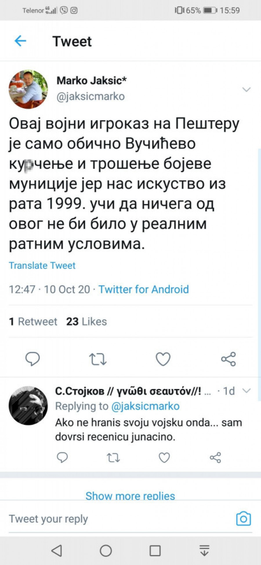- Ovaj vojni igrokaz na Pešteru samo je obično Vučićevo ku*čenje i trošenje bojeve municije jer nas iskustvo iz rata 1999. godine uči da ničega od ovog ne bi bilo u realnim ratnim uslovima - napisao je Jakšić na Tviteru.