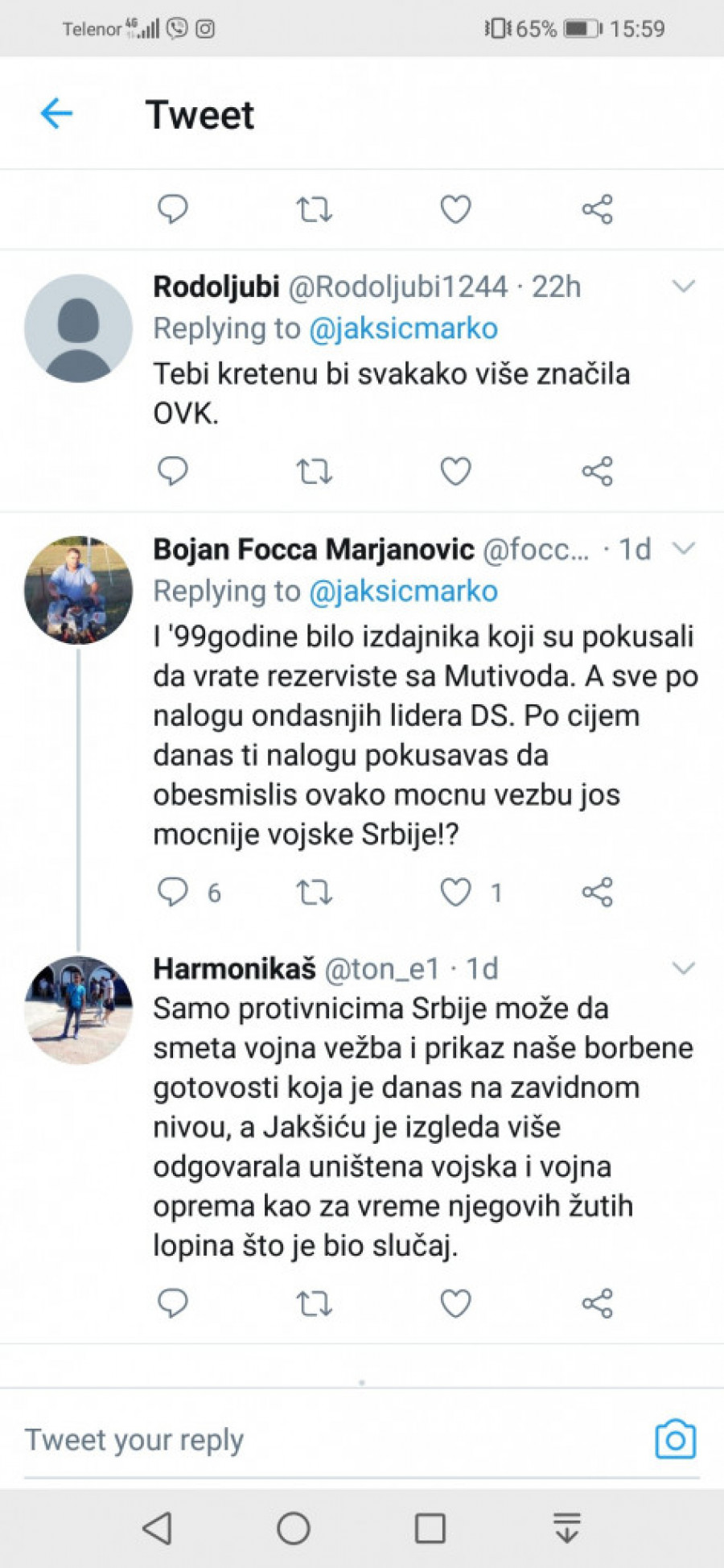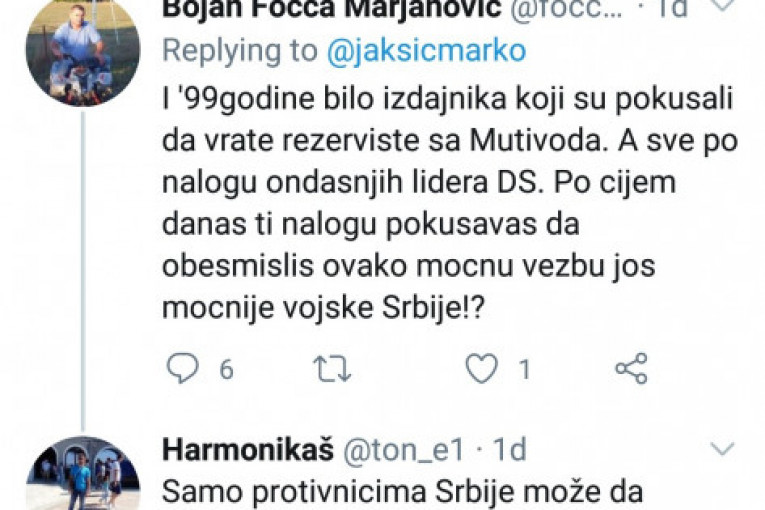 Umesto podrške, Jakšića su njegovi pratioci na društvenim mrežama pitali po čijem nalogu pokušava da obesmisli vojnu vežbu. Među komentarima bilo je i onih koji su, ogorčeni zbog Jakšićevih reči, pitali da li mu više znači teroristički OVK.