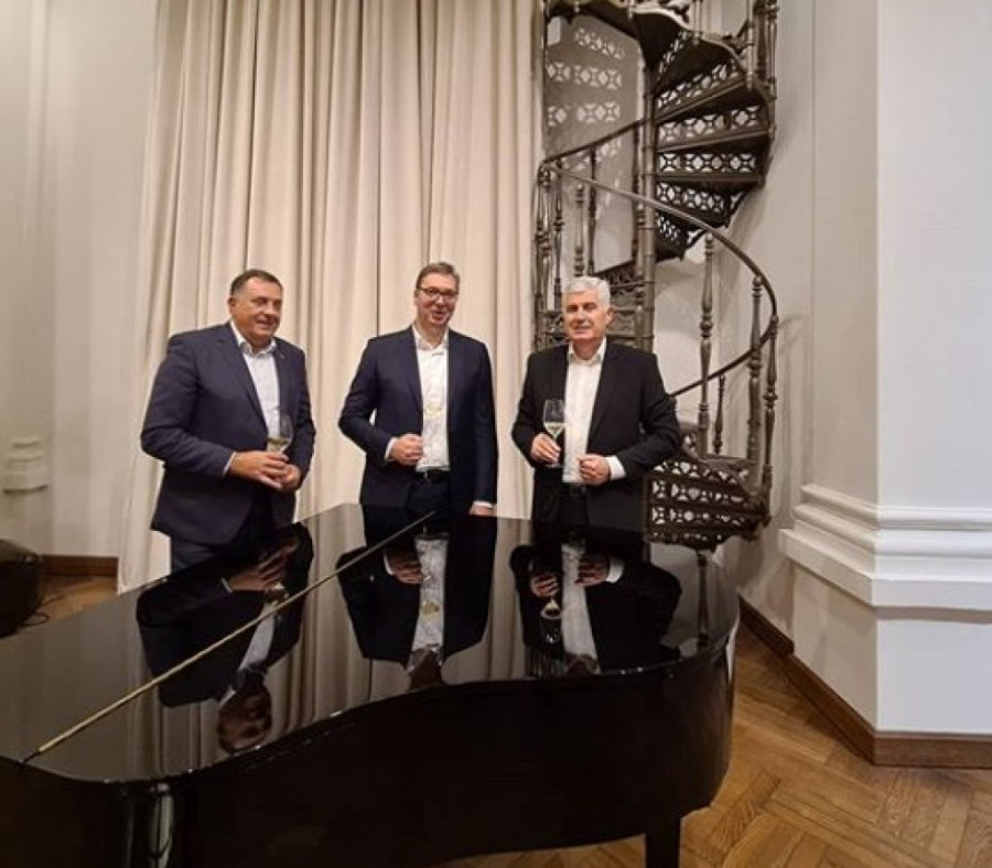 Predsednik Srbije Aleksandar Vučić ugostio je večeras srpskog člana Predsedništva BiH Milorada Dodika i predsednika Hrvatske demokratske zajednice (HDZ) BiH i zamenika predsedavajućeg Doma naroda Parlamentarne skupštine BiH Dragana Čovića.