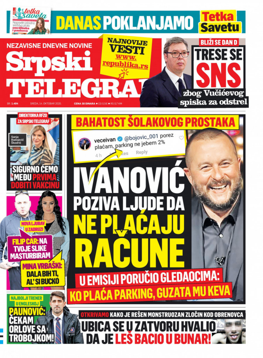 Voditelj Nove S Ivan Ivanović hvali se da ne plaća obaveze i kaže da "parking ne je*e ni dva odsto"! Za razliku od "običnih" građana poput penzionera, koji od usta odvajaju da bi izmirili dažbine, on valjda zbog ogromne zarade može tako da se bahati i baca pare na kamate za neplaćene račune i troškove izvršitelja. Opasnije je, upozoravaju sagovornici Srpskog telegrafa, što takvim modelom neodgovornog ponašanja i nepoštovanja državnih institucija promoviše i priziva anarhiju i nasilje.