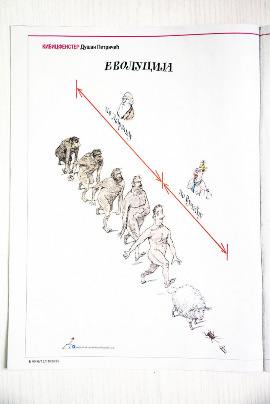 U današnjem nedeljniku NIN osvanula je sramna karikatura na kojoj je prikazana evolucija po Darvinu i "po Vučiću", gde se čovek prvo pretvara u ovcu, pa bubu i na kraju u crva.