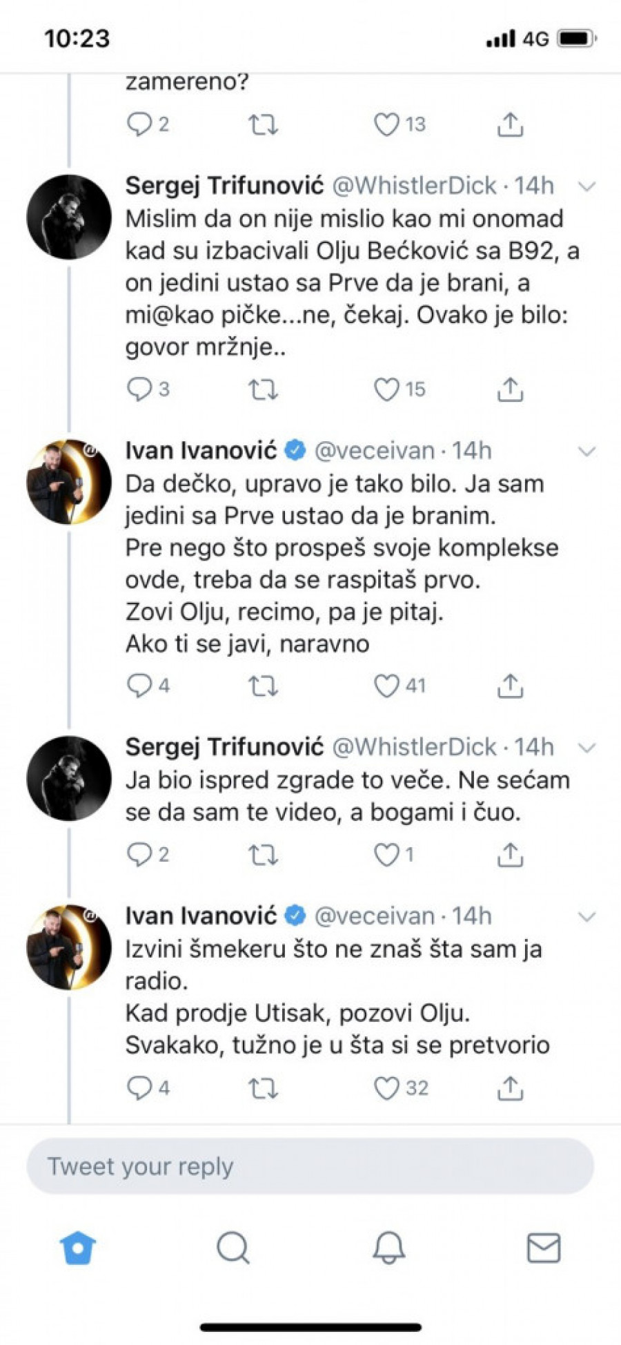 - Mislim da on nije mislio kao mi onomad kad su izbacivali Olju sa B92, a on jedini ustao sa Prve da je brani, a mi pi*ke... Ne, čekaj. Ovako je bilo: govor mržnje - napisao je Trifunović na šta mu je Ivanović odgovorio:
