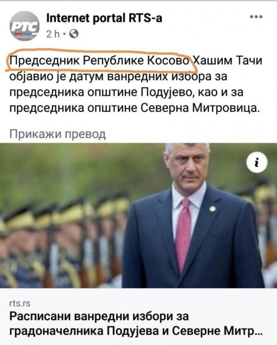 "Predsednik Republike Kosovo Hašim Tači objavio je datum vanrednih izbora...", piše u sramnom naslovu na portalu RTS-a.
