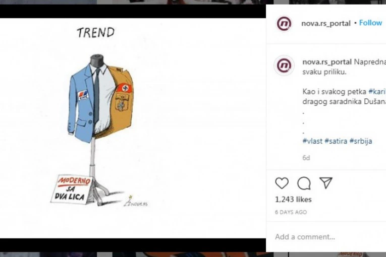 Naime, portal Nova objavio je na svom Instagram profilu skandaloznu karikaturu osvedočenog srbomrsca Dušana Petričića u kojoj je Srpska napredna stranka optužena za fašizam (?!).