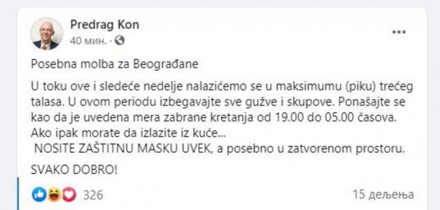 - U toku ove i sledeće nedelje nalazićemo se u maksimumu (piku) trećeg talasa. U ovom periodu izbegavajte sve gužve i skupove. Ponašajte se kao da je uvedena mera zabrane kretanja od 19.00 do 05.00 časova. Ako ipak morate da izlazite iz kuće... - napisao je Kon.