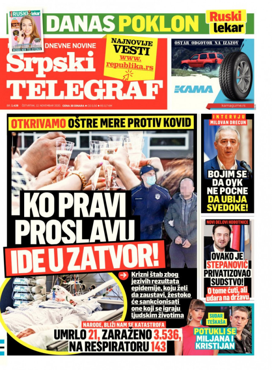 - Policija da piše krivične prijave, a tužilaštvo da procesuira odgovorne. Ovo se, pre svega, odnosi na osobe koje ne poštuju mere o broju prisutnih u zatvorenim prostorijama, radnom vremenu i drugo. Zdravstveno-epidemiološka situacija preti da se otrgne kontroli. Svi nadležni organi moraju da primene sva zakonska ovlašćenja da bi kaznili društveno neprihvatljiva ponašanja. Nažalost, samo najstrože kazne će imati efekat u sankcionisanju neodgovornih pojedinaca - jasan je tužilac.