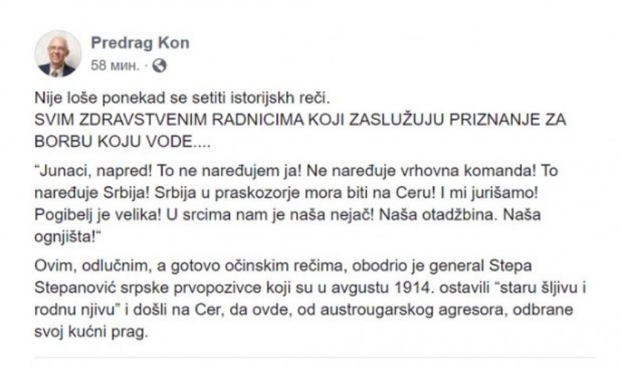 Foto: Printscreen/facebook.comOvim, odlučnim, a gotovo očinskim rečima, obodrio je general Stepa Stepanović srpske prvopozivce koji su u avgustu 1914. ostavili “staru šljivu i rodnu njivu” i došli na Cer, da ovde, od austrougarskog agresora, odbrane svoj kućni prag - naveo je Kon istorijske reči ne bi li obodrio lekare da izdrže najjači pritisak od početka epidemije.