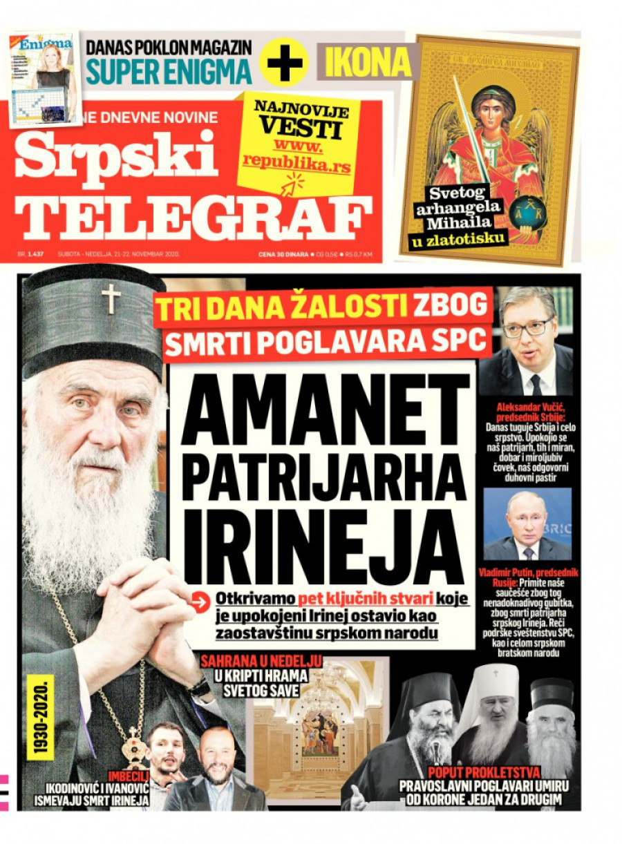 Njegova svetost patrijarh srpski, arhiepiskop pećki i mitropolit beogradsko-karlovački Irinej (90) preminuo je u petak ujutru, u 07.07, od posledica virusa korona u Vojnomedicinskom centru Karaburma, gde je bio smešten od 4. novembra, kad je potvrđeno prisustvo KOVID. Samo tri dana ranije služio je višesatnu liturgiju i opelo u Podgorici na sahrani mitropolita crnogorsko-primorskog Amfilohija, koji je takođe preminuo od korone.