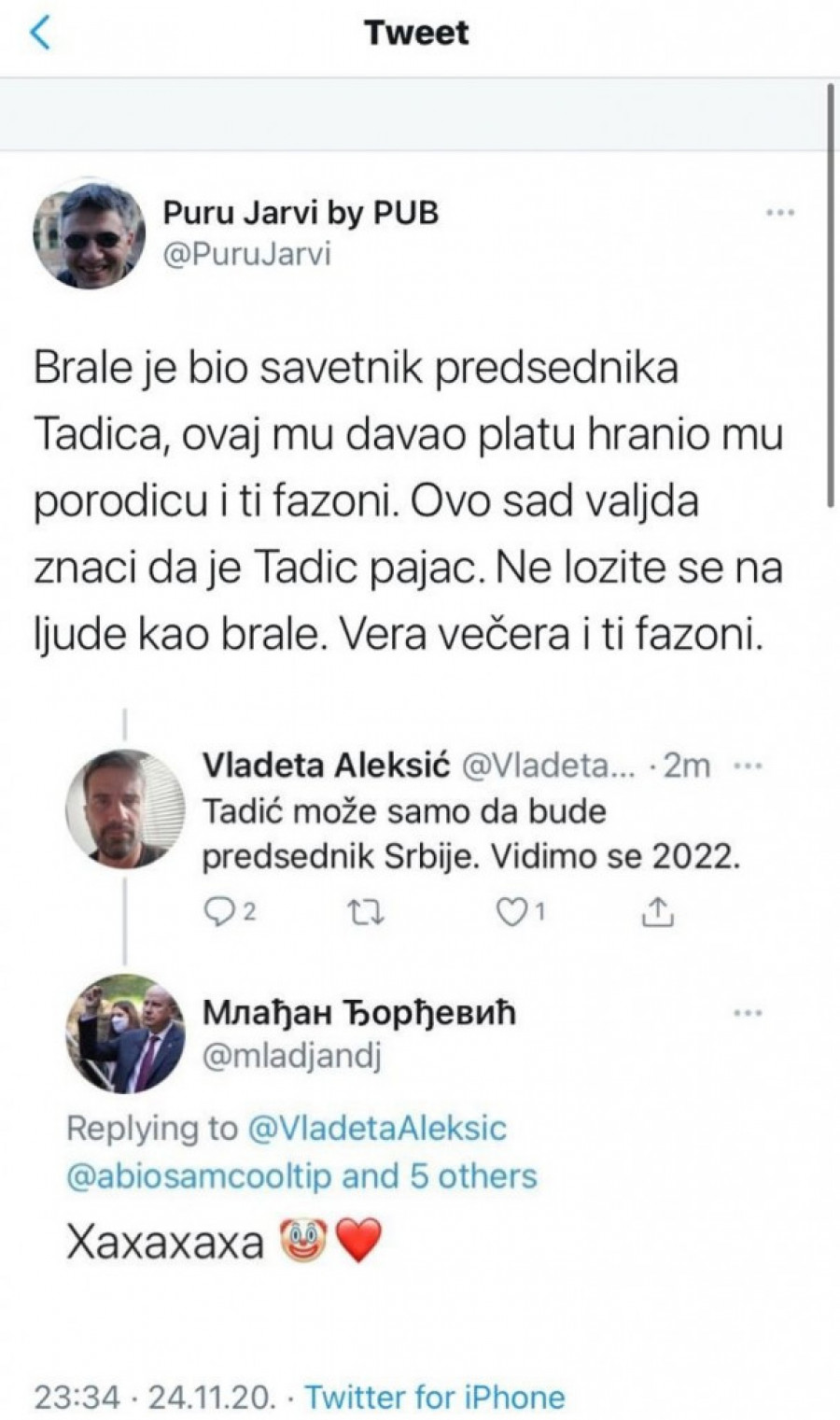 Foto: Tanjug/D. VOJINOVIĆ- Brale je bio savetnik predsednika Tadića, ovaj mu davao platu i hranio mu porodicu i ti fazoni. Ovo sad valjda znači da je Tadić pajac. Ne ložite se na ljude kao brale. Vera večera i ti fazoni - glasi objava sa Tvitera na koju se Mlađan ismejao potvrdiviši, sa sve sličicom klovna u znak odobravanja i slaganja sa gore navedenim.