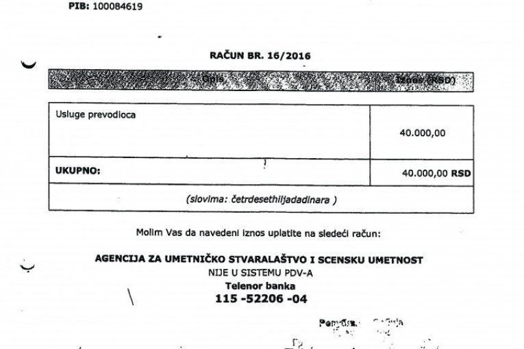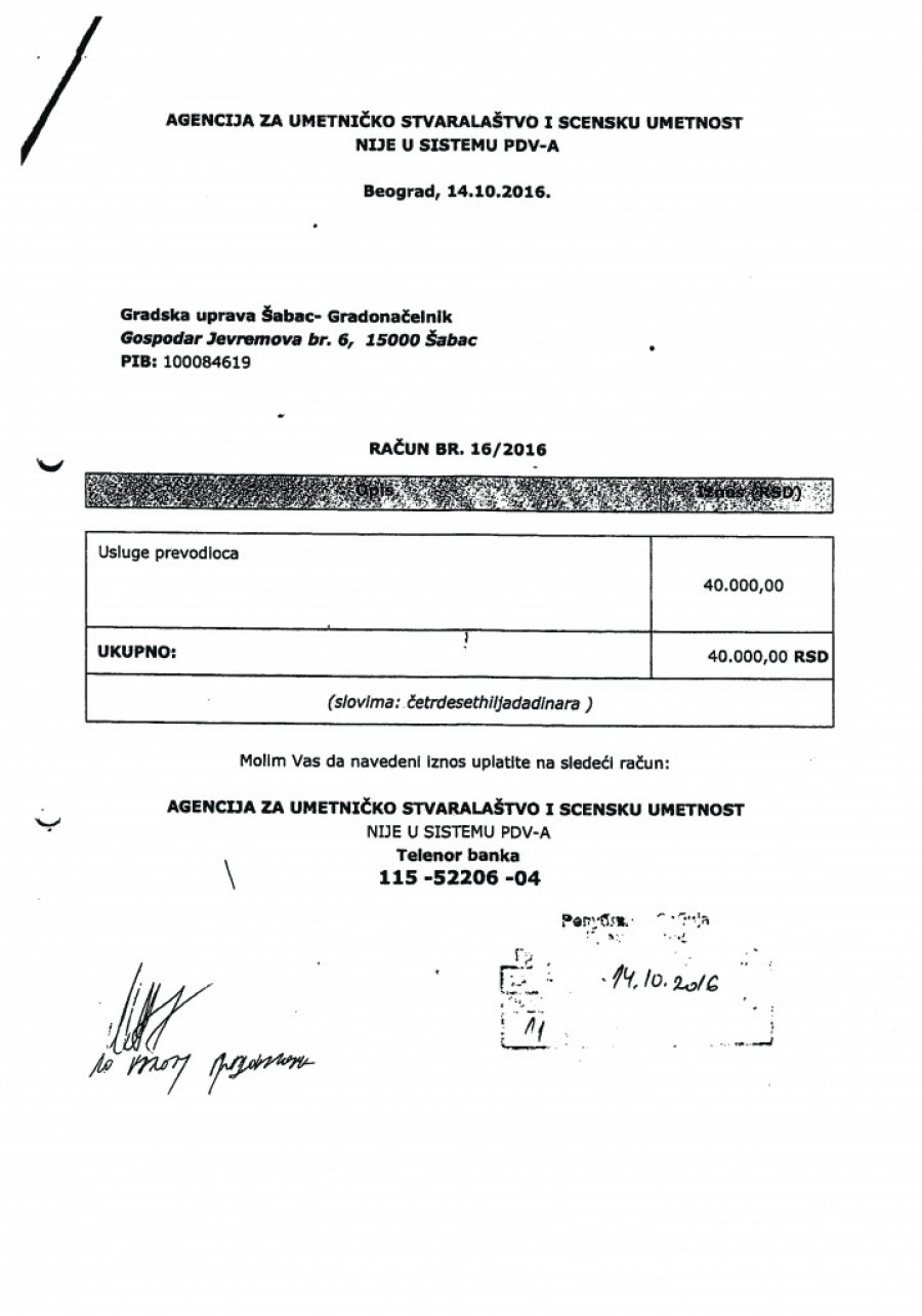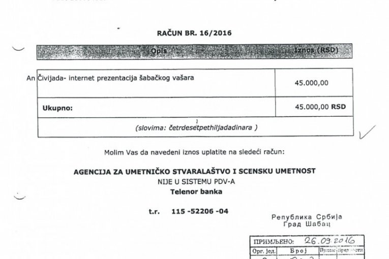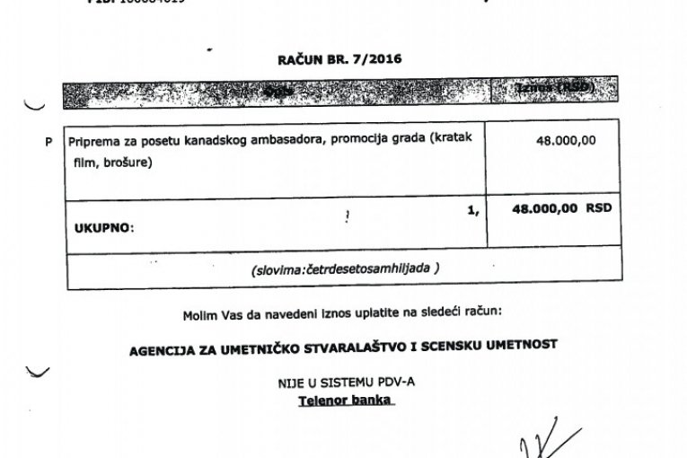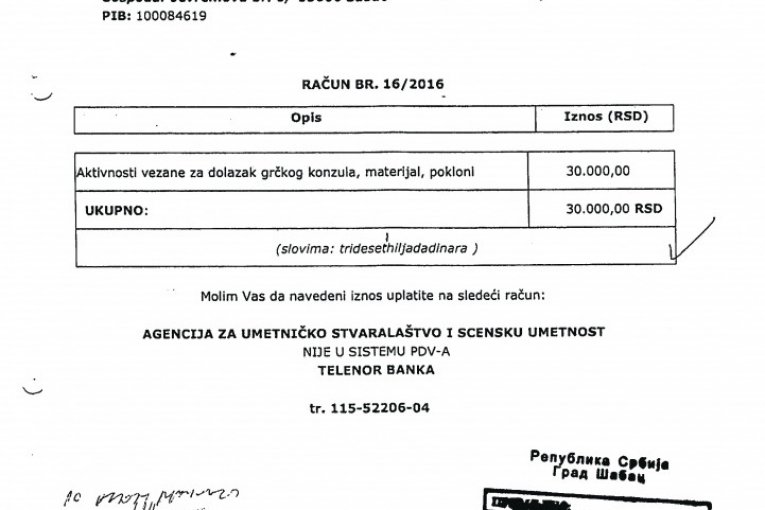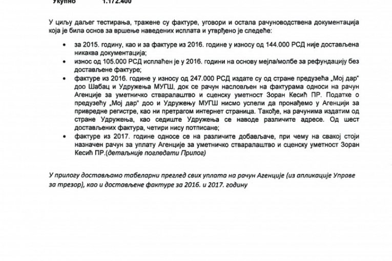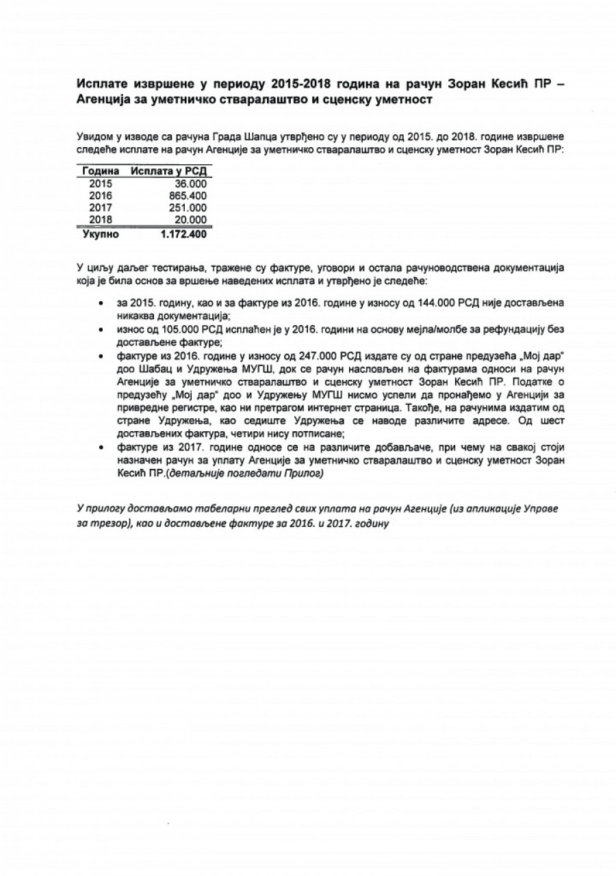 Nedostaje dokumentacijaU cilju daljeg testiranja tražena je računovodstvena dokumentacija, koja je bila osnov za vršenje navedenih isplata, ali je utvrđeno da za 2015, kao i za fakture u iznosu od 144.000 dinara, nije dostavljena dokumentacija. Iznos od 105.000 dinara isplaćen je 2016. bez dostavljene fakture, na osnovu molbe za refundaciju. Fakture u iznosu od 247.000 dinara izdate su od preduzeća "Moj dar" D. O. O. Šabac i Udruženja MUGŠ, koji ne postoje u APR, a na računima izdatim od udruženja kao sedište udruženja navode se različite adrese. Fakture iz 2017. odnose se na različite dobavljače, pri čemu na svakoj stoji naznačen račun za uplatu agencije Zorana Kesića. |