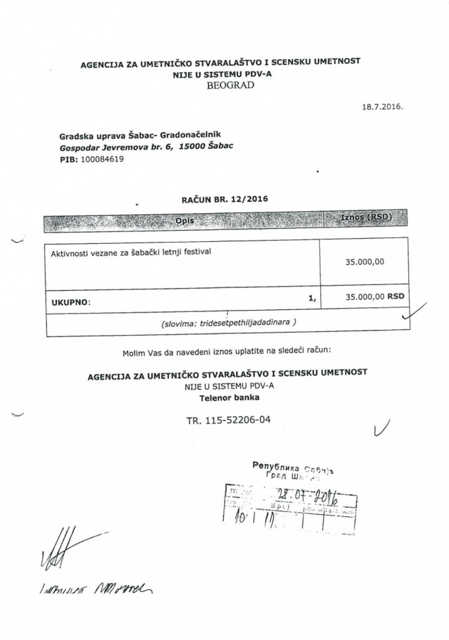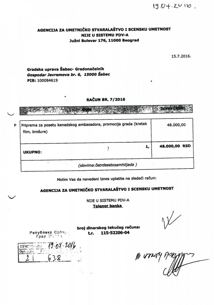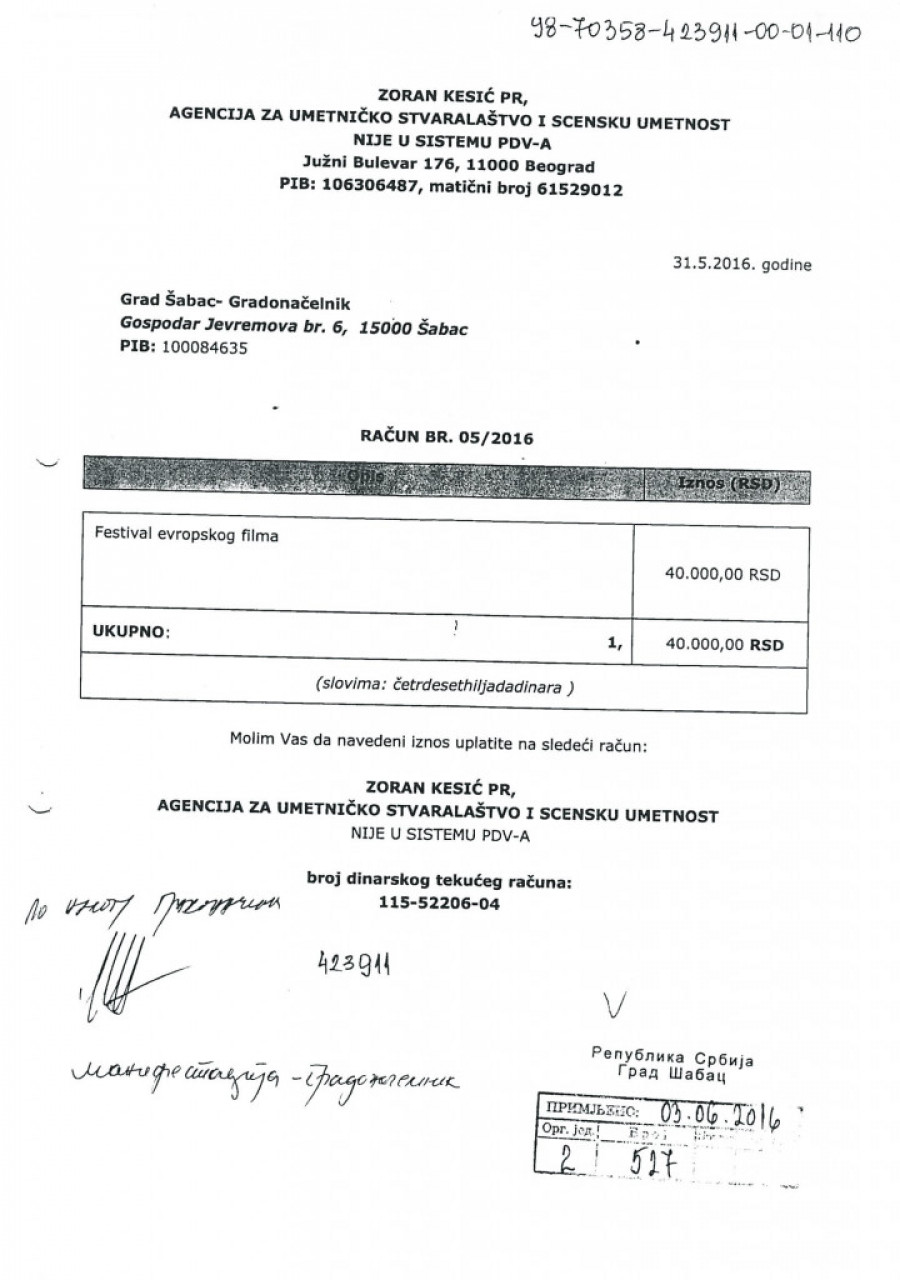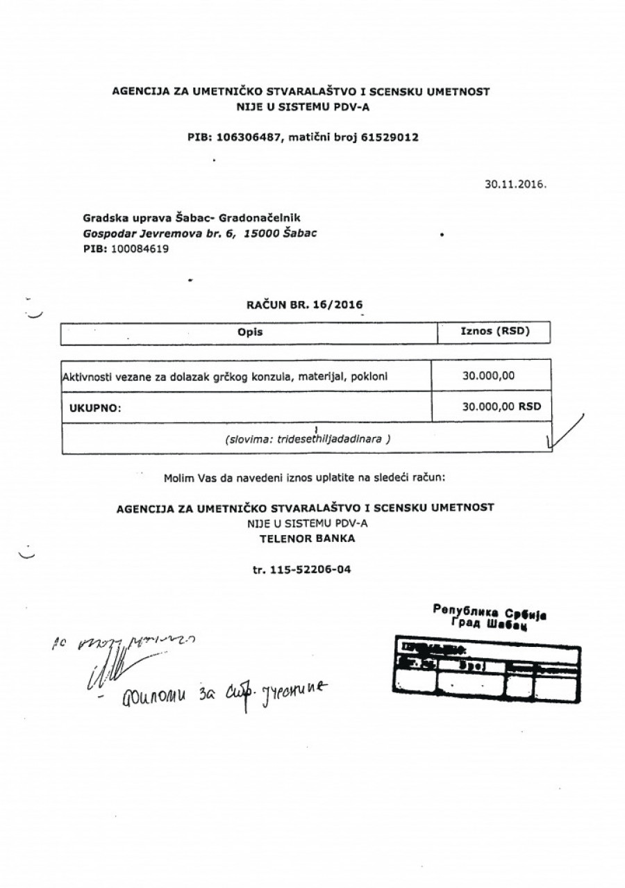 Nedostaje dokumentacijaU cilju daljeg testiranja tražena je računovodstvena dokumentacija, koja je bila osnov za vršenje navedenih isplata, ali je utvrđeno da za 2015, kao i za fakture u iznosu od 144.000 dinara, nije dostavljena dokumentacija. Iznos od 105.000 dinara isplaćen je 2016. bez dostavljene fakture, na osnovu molbe za refundaciju. Fakture u iznosu od 247.000 dinara izdate su od preduzeća "Moj dar" D. O. O. Šabac i Udruženja MUGŠ, koji ne postoje u APR, a na računima izdatim od udruženja kao sedište udruženja navode se različite adrese. Fakture iz 2017. odnose se na različite dobavljače, pri čemu na svakoj stoji naznačen račun za uplatu agencije Zorana Kesića. |